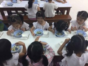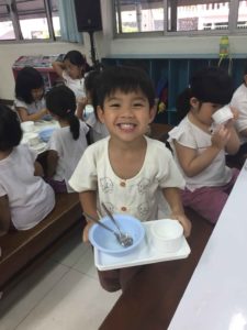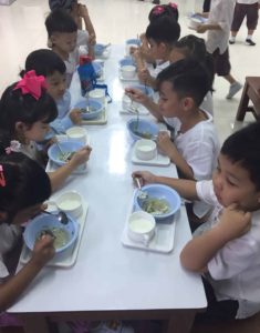 9.30 น.           นม + ขนมปังชนิดต่างๆ (นมผง คาร์เนชั่น สลับกับนมถั่วเหลือง ทุกวันอังคาร , พฤหัสบดี)
